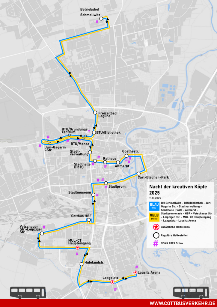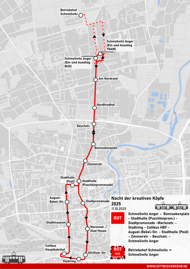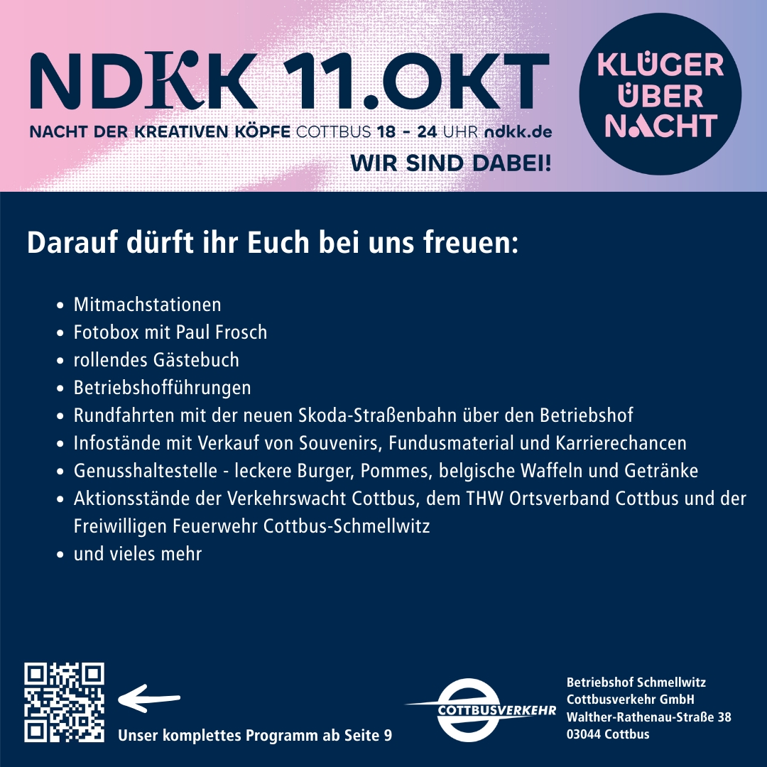 Am 11. Oktober 2025 findet von 18:00 Uhr bis 24:00 Uhr in Cottbus die „Nacht der kreativen Köpfe“ statt. Zu diesem Anlass stellt Cottbusverkehr zwei zusätzliche Buslinien und eine zusätzliche Straßenbahnlinie zur Verfügung und wird als Teilnehmer in diesem Jahr ebenfalls präsent sein.