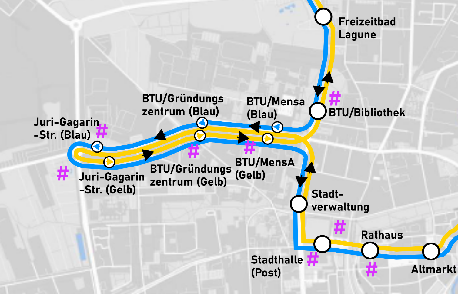 Die beiden Buslinien verkehren als Ringlinien auf derselben Strecke in entgegengesetzter Richtung. Dabei bedienen die als „gelb“ und „blau“ gekennzeichneten Linien die bestehenden Haltestellen „Hufelandstraße“, „Vetschauer Straße/Leipziger Straße“, „Hauptbahnhof“, „Stadtmuseum“, „Stadtpromenade“, „Carl-Blechen-Park“, „Goethestraße“, „Altmarkt“, „Rathaus“, „Stadthalle Post“, „Stadtverwaltung“, „BTU / Mensa“, „Juri-Gagarin-Straße“, „BTU / Gründungszentrum“, „BTU / Bibliothek“, und „Freizeitbad Lagune“ und „Betriebshof Schmellwitz“.