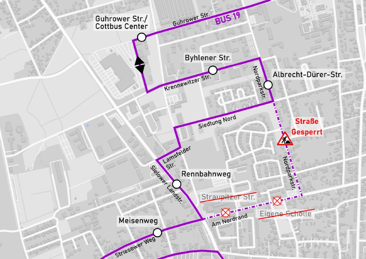 Die Haltestelle Staupitzer Straße und Eigene Scholle werden nicht bedient. Die Buslinie 19 wird über die Sielower Landstraße, Lamsfelder Straße und weiter über Siedlung Nord umgeleitet. Ab der Nordparkstraße fährt die Buslinie 19 wieder regulär. Die Haltestelle Rennbahnweg wird zusätzlich bedient.