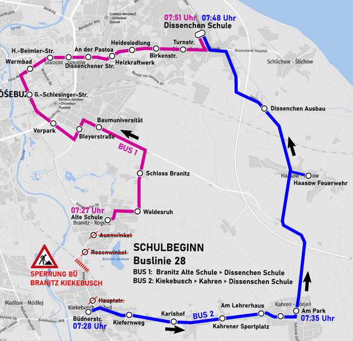 Die Fahrt um 07:14 Uhr ab Haltestelle „Kahren Am Park“ in Richtung Dissenchen Schule wird auf 07:27 Uhr ab Haltestelle „Branitz Alte Schule“ verlegt. Der Abschnitt von Haltestelle „Kahren Am Park“ bis „Branitz Alte Schule“ (07:14 Uhr – 07:27 Uhr) entfällt auf dieser Fahrt. Schulkinder aus Branitz bzw. Branitzer Siedlung nutzen diesen Bus 1 in Richtung Schule Dissenchen.