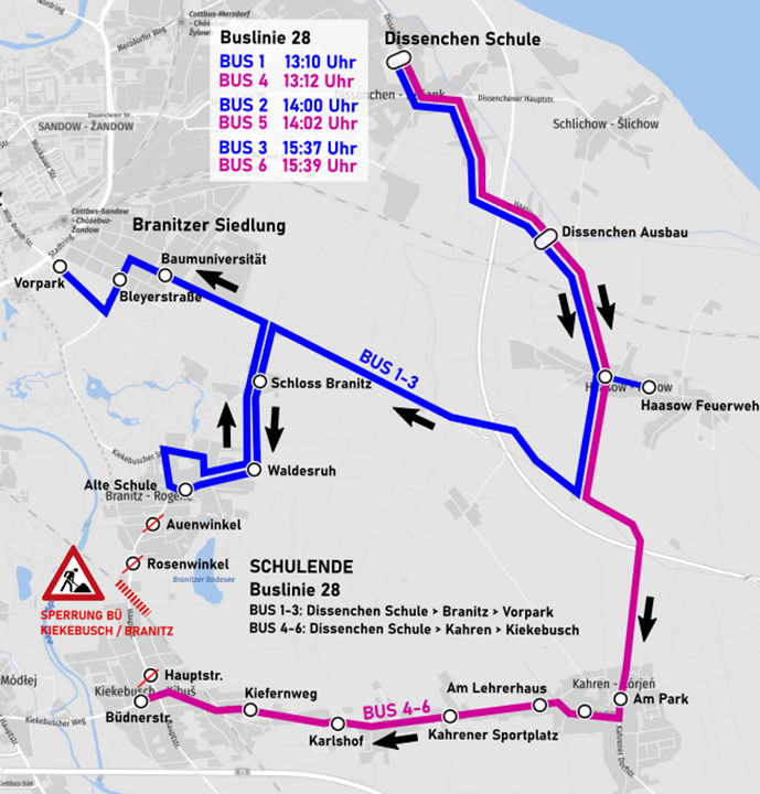 Zum Schulende werden Sonderbusse für die Schulkinder nach Haasow, Kahren und Kiekebusch um 13:12 Uhr, 14:02 Uhr und 15:39 Uhr ab Dissenchen Schule eingesetzt. Für Schulkinder nach Branitz und Branitzer Siedlung gibt es Sonderfahrten um 13:10 Uhr, 14:00 Uhr und 15:37 Uhr.