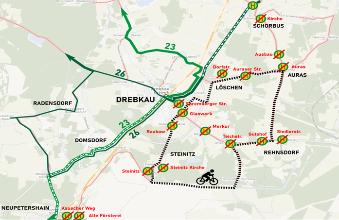 Am Freitag, den 10. April 2026, kommt es in Drebkau und Umland ab 16:00 Uhr zu Behinderungen des ÖPNV. Die Buslinie 23 verkehrt in dieser Zeit abweichend über Domsdorf und Neupetershain Nord. Von dort über die L 522 bis zur Haltestelle „Neupetershain Gemeindeverwaltung“ weiter regulär bis zur jeweiligen Endhaltestelle und zurück. Die Ortschaften Raakow und Steinitz können während des Radrennens nicht bedient werden. Betroffen sind folgende Fahrten: