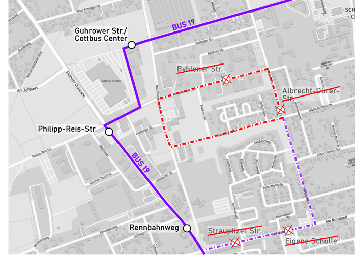 Am Samstag, den 11. April, kommt es von 15:00 Uhr bis circa 19:00 Uhr in Cottbus zu Behinderungen des ÖPNV. Die Buslinie 19 verkehrt in diesem Zeitraum von der Vogelsiedlung aus kommend bis Meisenweg, dann abweichend über die Zusatz-Haltestelle „Rennbahnweg“, „Philipp-Reis-Straße“ weiter bis „Guhrower Str./ Cottbus Center“ und ab dort regulär und wieder zurück. Die Haltestellen „Byhlener Straße“, „Albrecht-Dürer-Straße“, „Eigene Scholle“ und „Straupitzer Straße“ können im betroffenen Zeitraum nicht bedient werden. Betroffen sind folgende Fahrten: