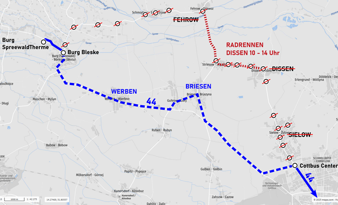 Am Sonntag, den 12. April, kommt es im Bereich Dissen zu Behinderungen des ÖPNV. Die Buslinie 44 wird von circa 08:00 Uhr bis circa 14:30 Uhr durch die Vollsperrung im Bereich Dissen / Striesow parallel zur Buslinie 47 geführt. Die Linie 44 verkehrt somit über Cottbus Hauptbahnhof, Cottbus Center, Briesen, Werben, Bleske (Steig 1) und Burg Spreewald-Therme. Die Haltestellen in Fehrow, Schmogrow, Striesow, Dissen und Cottbus Sielow werden nicht bedient. Betroffen sind folgende Fahrten: