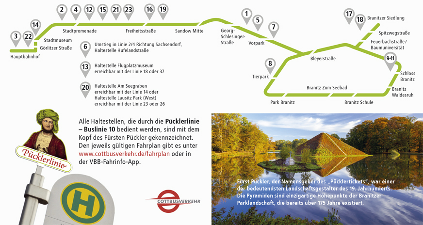 Eine weitere Besonderheit ist die Pücklerlinie (Buslinie 10), die am Hauptbahnhof startet und im Rundkurs an zahlreichen Sehenswürdigkeiten hält und vorbeifährt. Alle touristisch wichtigen Haltestellen sind eigens mit dem Kopf Pücklers gekennzeichnet, sodass jeder Fahrgast erkennt, wenn er sich „auf den Spuren Pücklers“ befindet.