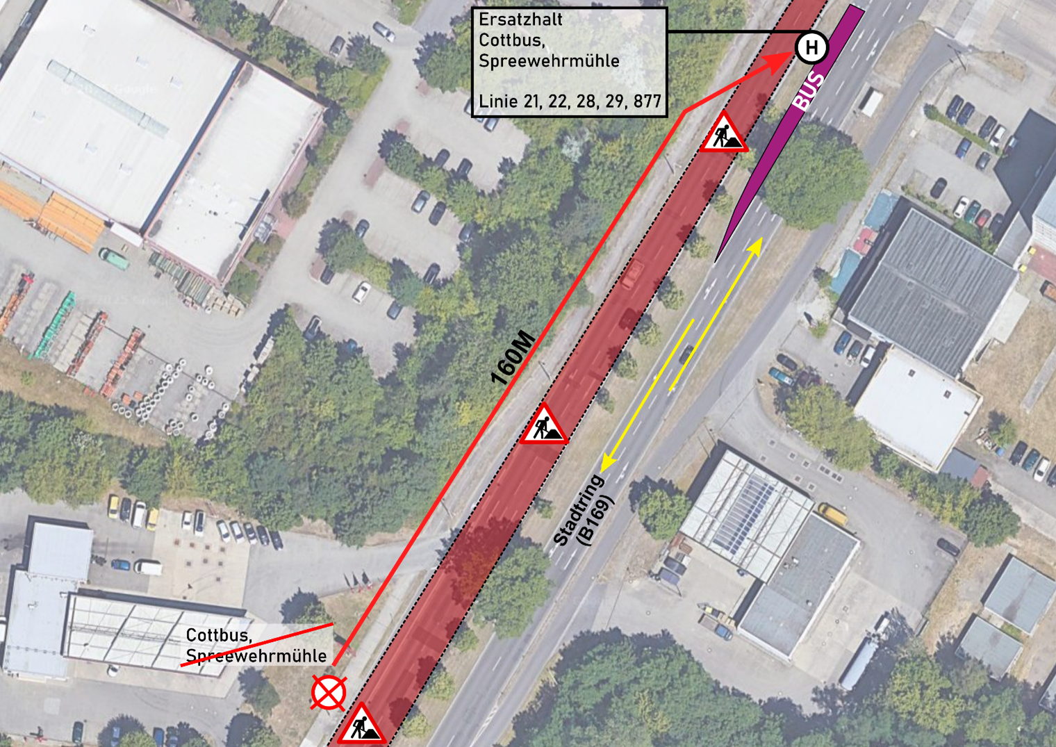 Der gesamte Verkehr wird von den Fahrspuren in Richtung Stadt stadtauswärts, je eine Fahrspur für jede Richtung, verlegt. Daher wird auch die Haltestelle „Cottbus Spreewehrmühle“ für die Dauer der Bauarbeiten um 160 m nach Norden verlegt. Die ursprüngliche Linksabbiegerspur wird als Busspur für die Haltestelle Spreewehrmühle in Richtung stadteinwärts genutzt.